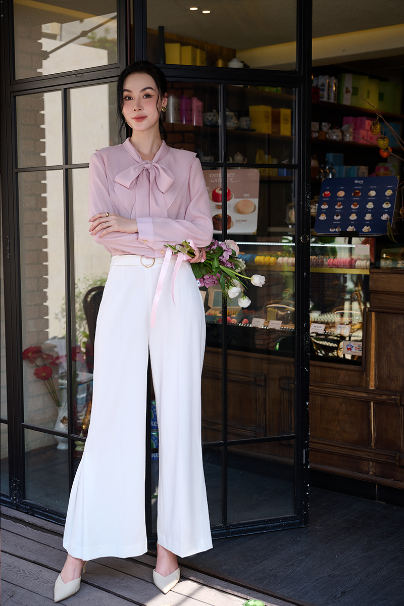 - Chuyên nghiệp nhưng vẫn có gu: Áo blouse cách điệu phối quần tây và giày loafer – hoàn hảo cho ngày làm việc chỉn chu.
