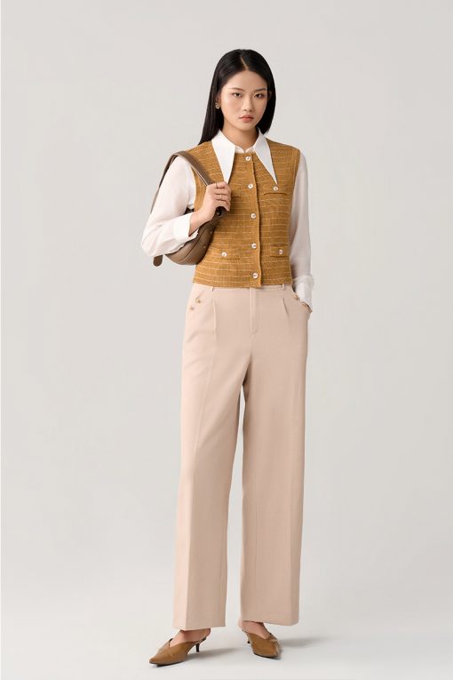 - Quần ống suông cạp cao: Thiết kế giúp hack dáng đỉnh cao, kéo dài đôi chân, che khuyết điểm vòng 2 hiệu quả.