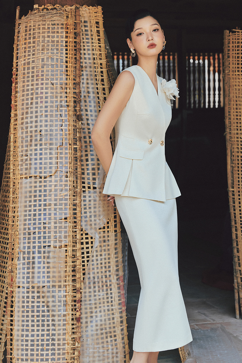 Áo khoác gile ly xúp gấu, ngực cài hoa