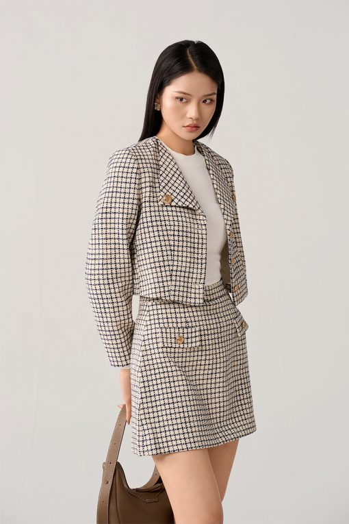 Áo khoác tweed croptop cổ U túi ốp
