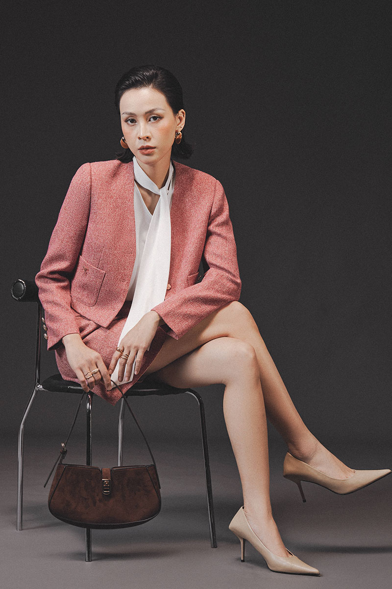 Áo khoác tweed croptop cổ V, túi ốp