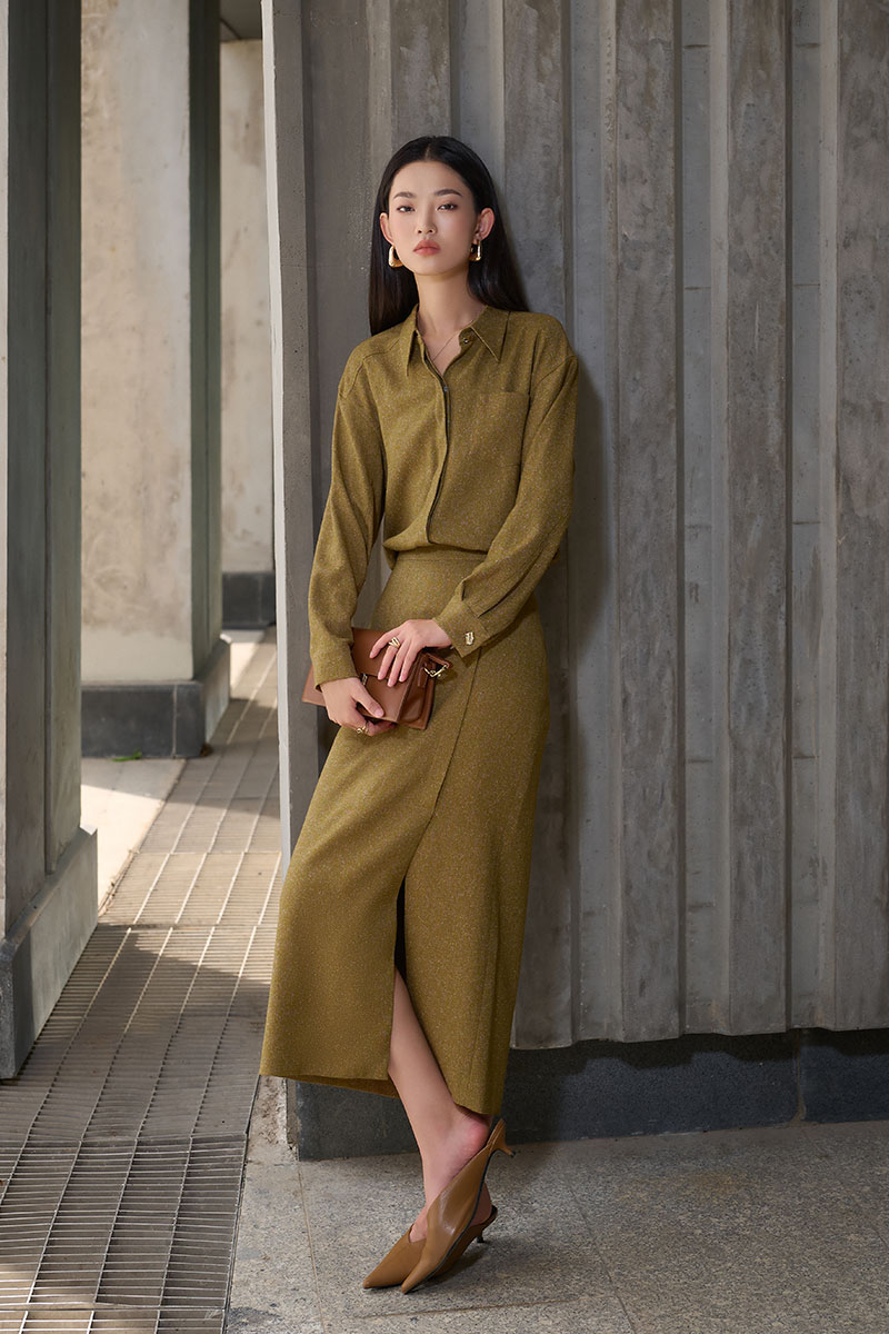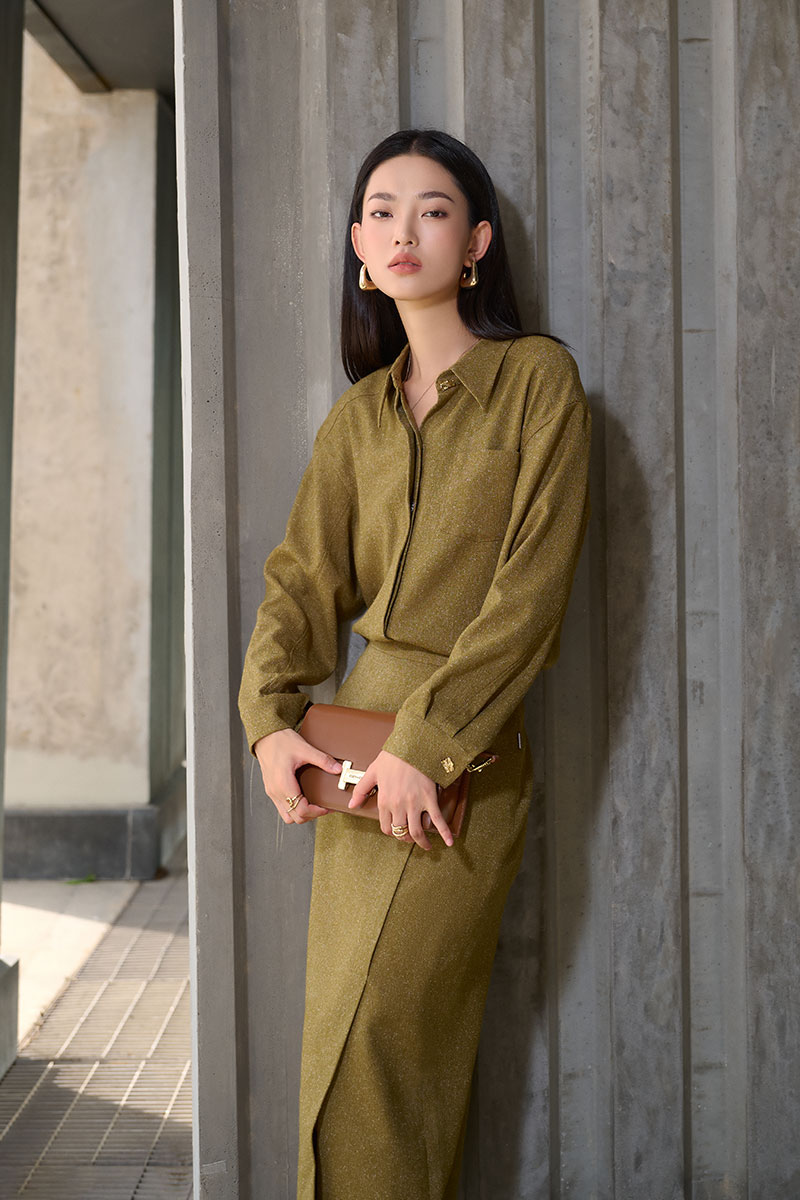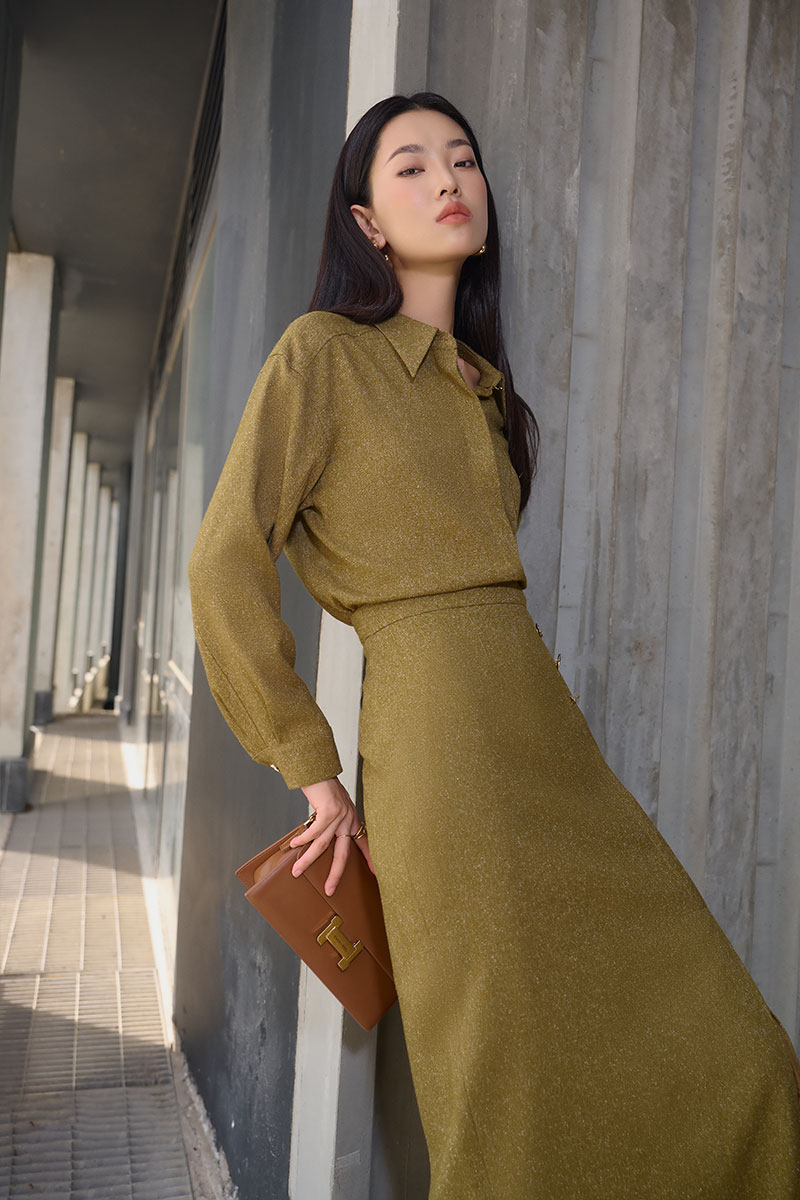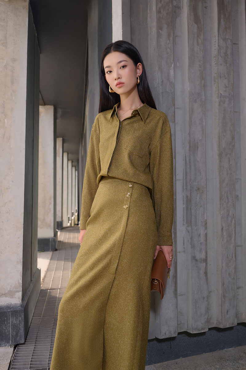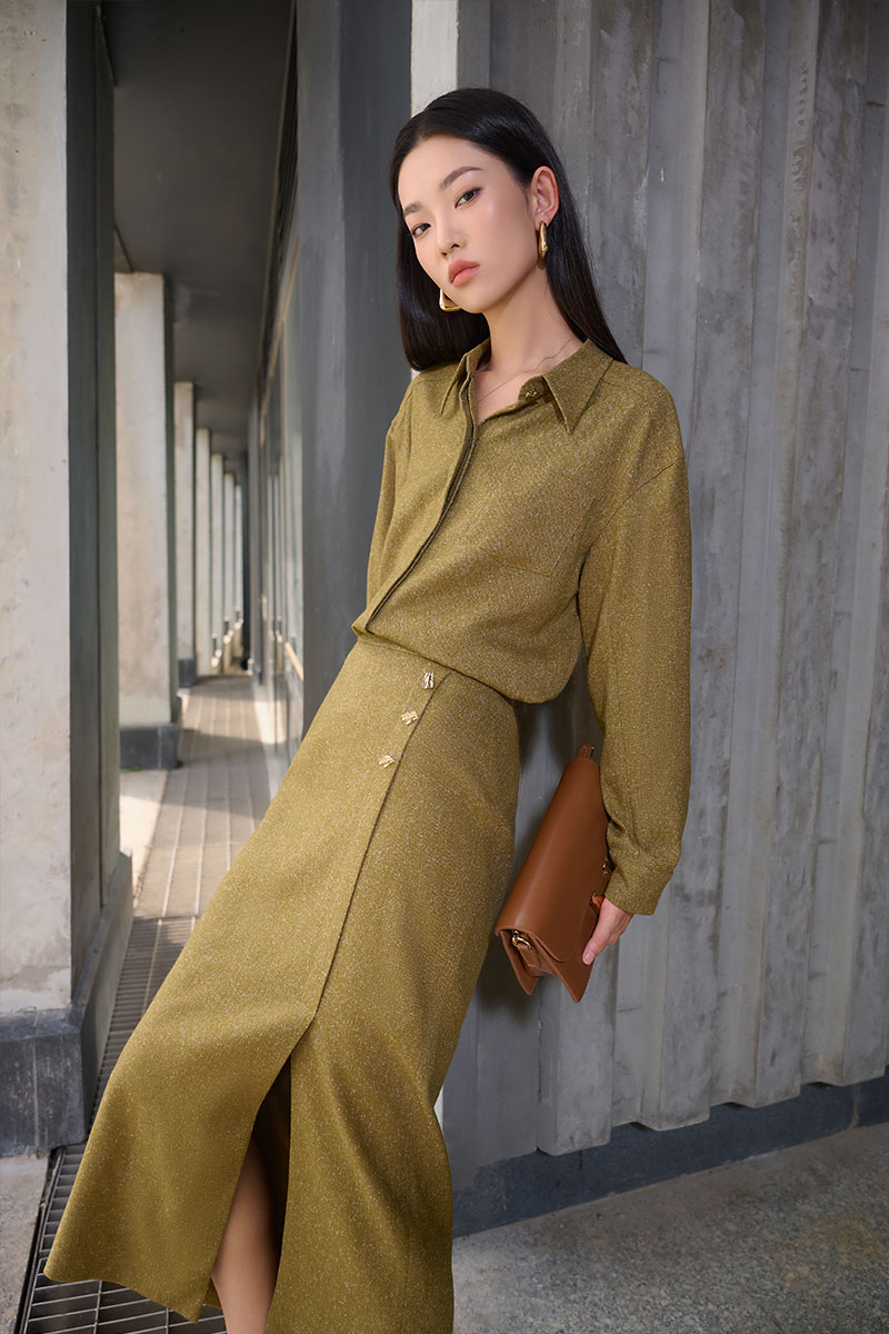 Chân váy dài xẻ chồng lệch hông đính cúc