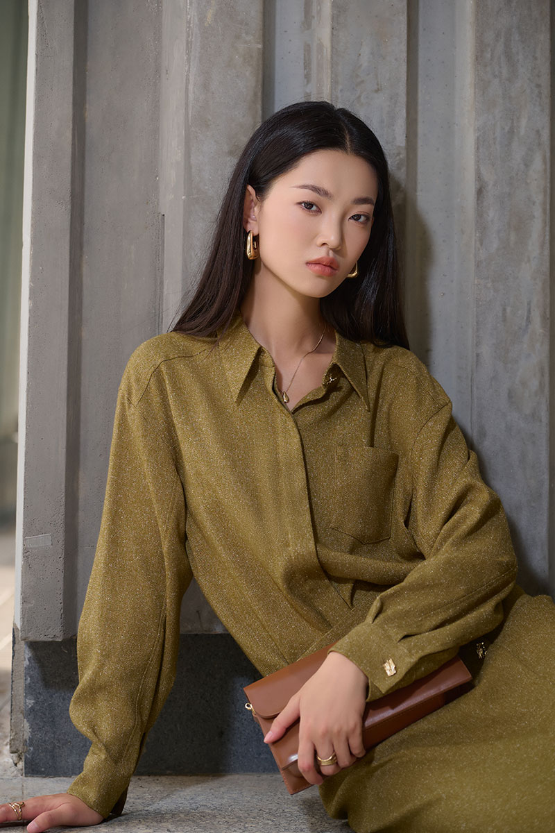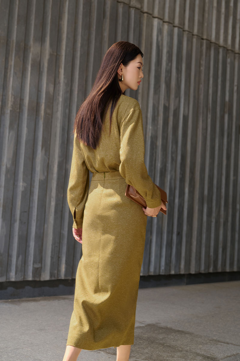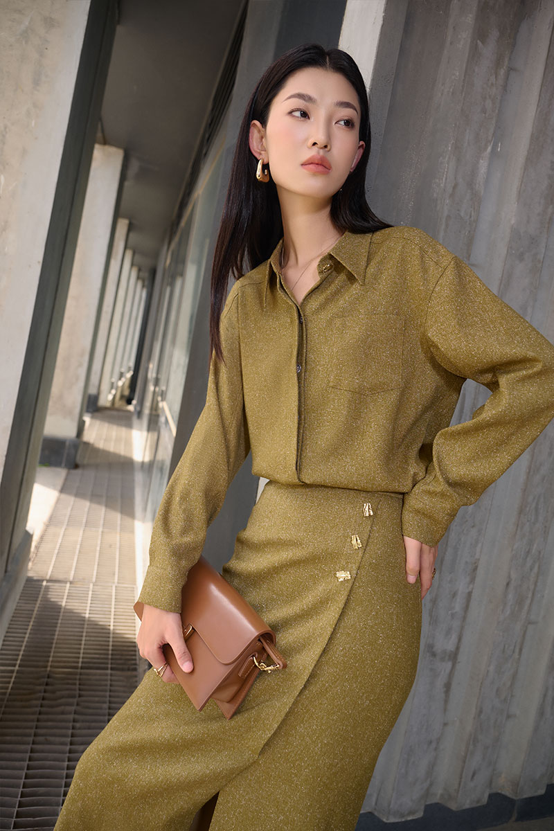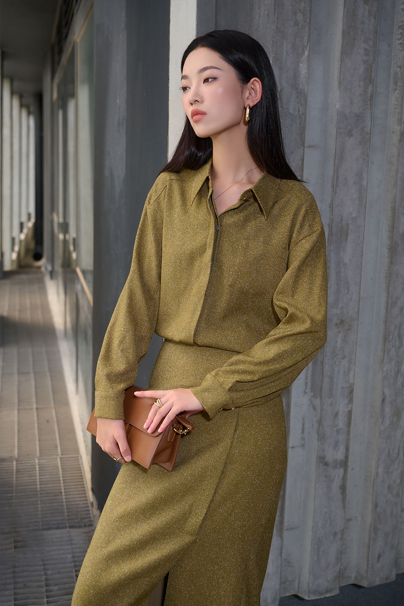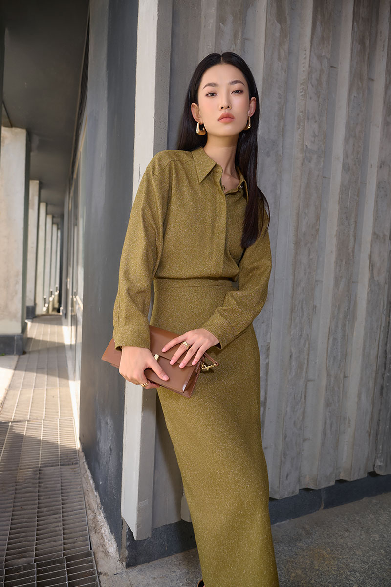 Chân váy dài xẻ chồng lệch hông đính cúc