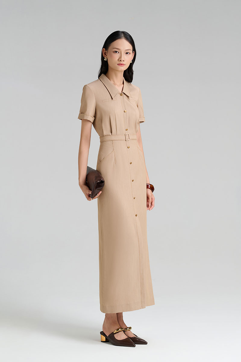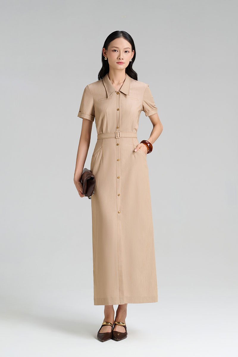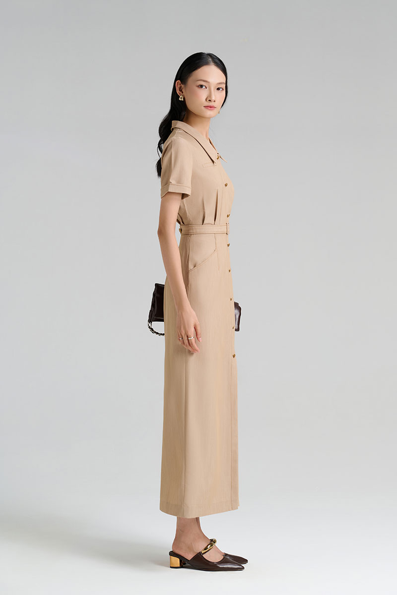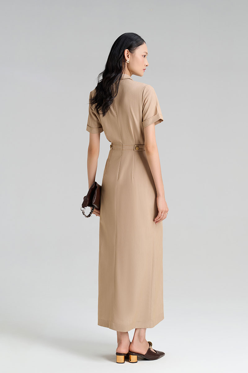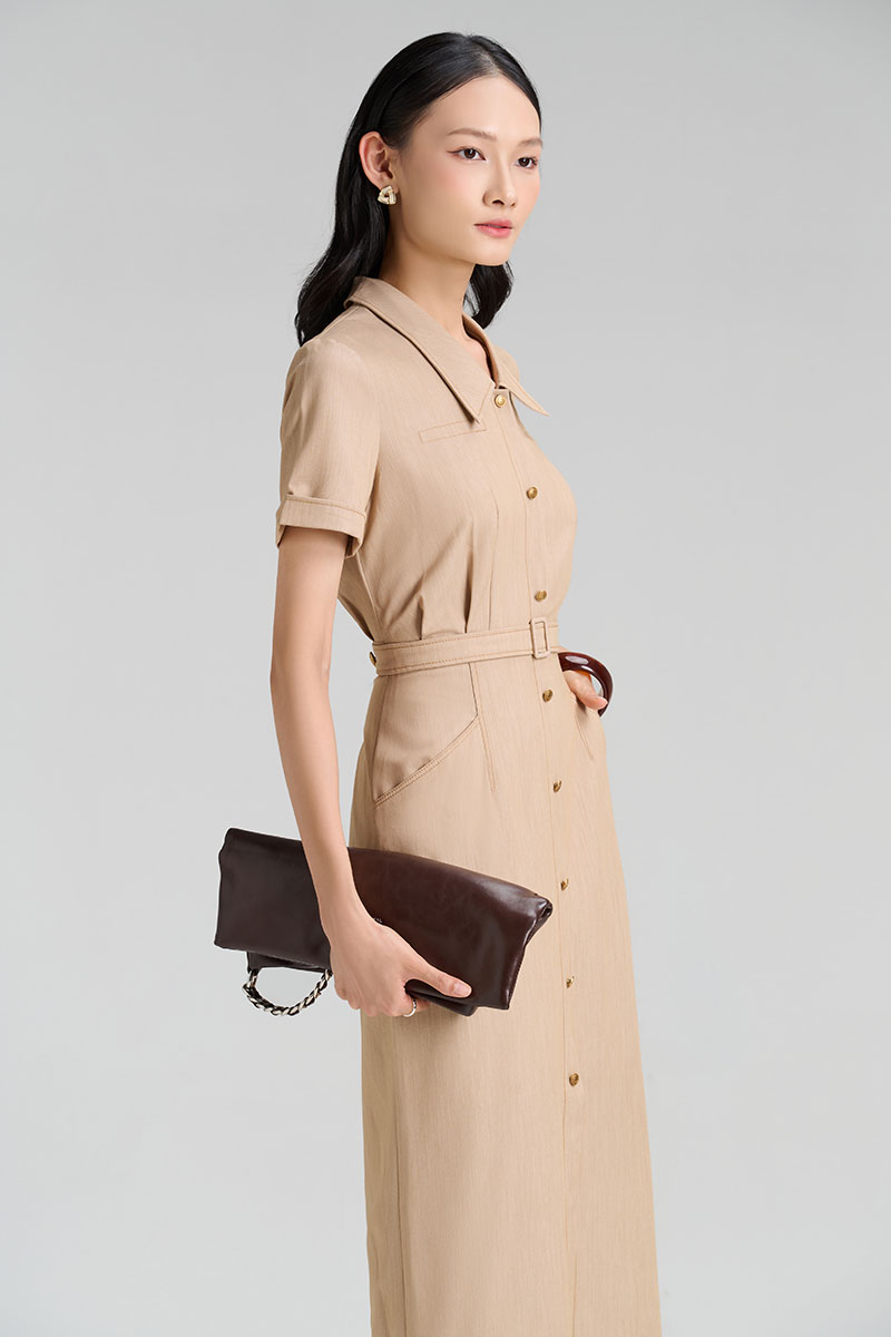 - Đặc điểm: Đầm ôm cổ V, xếp ly phần eo, đai đính cúc kim loại, diễu chỉ nổi, xẻ trước.