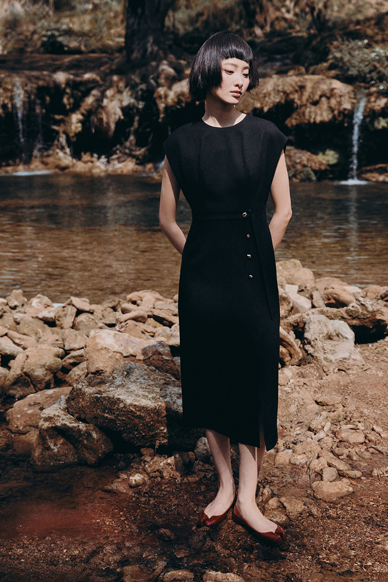 Đầm ôm vai chờm đai eo đính cúc