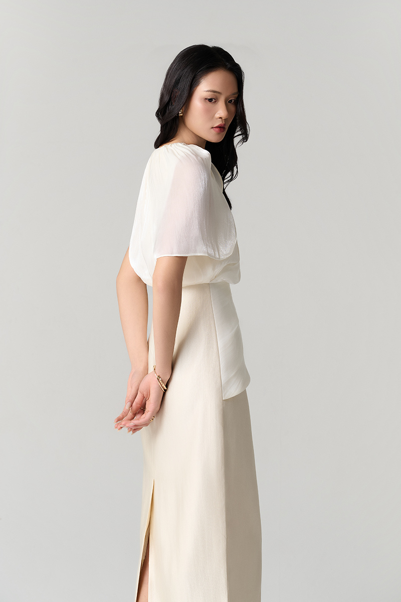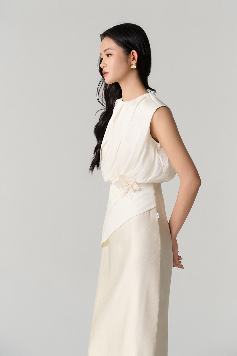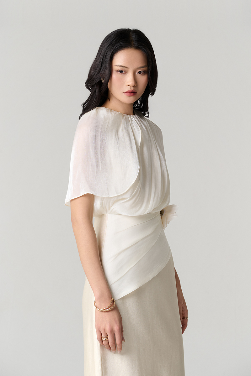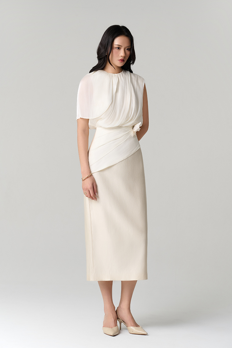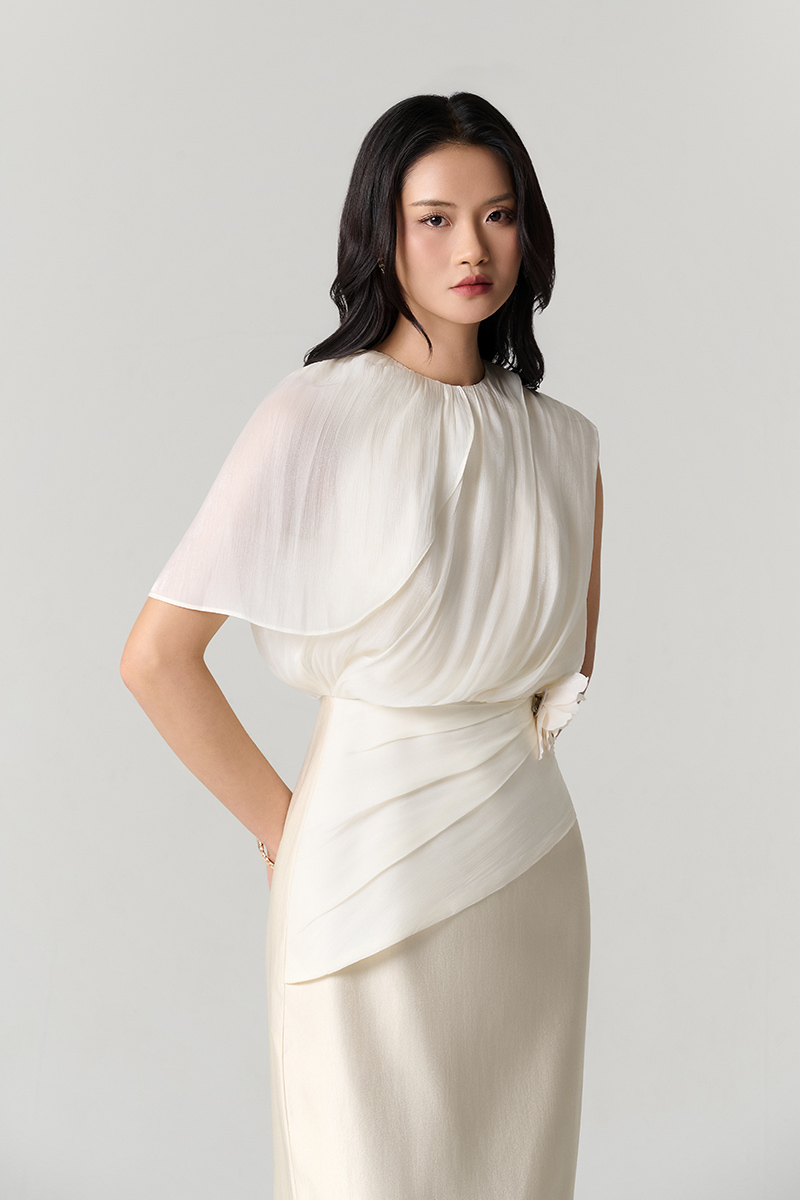 Đầm party phối tơ, xếp sóng cài hoa
