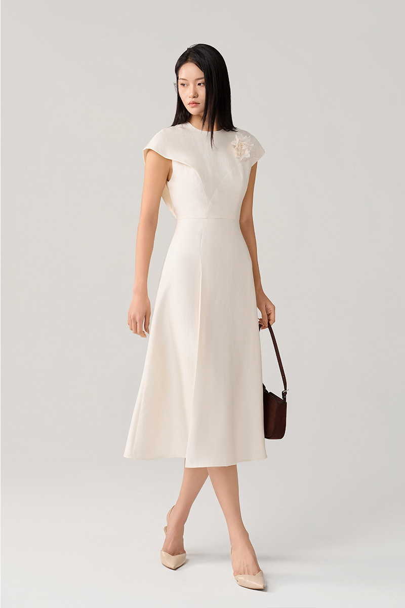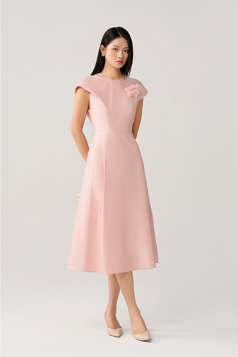 Đầm xòe tay liền thân cài hoa ngực