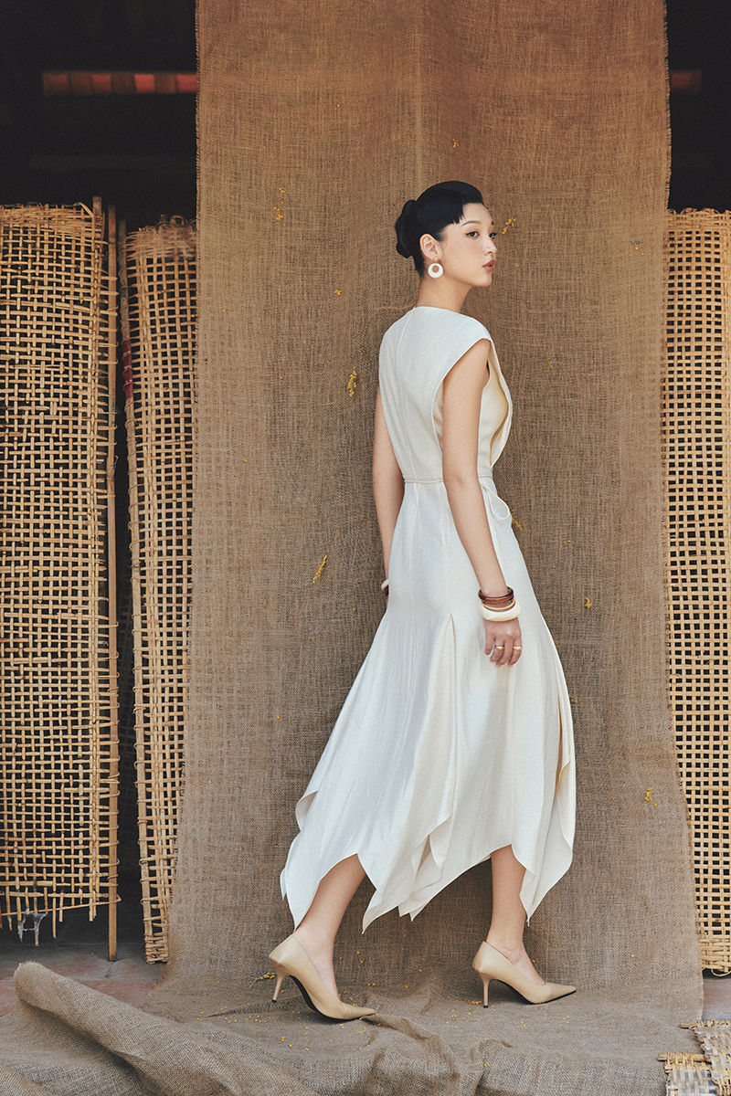 Đầm xoè vai chờm tà can rủ múi