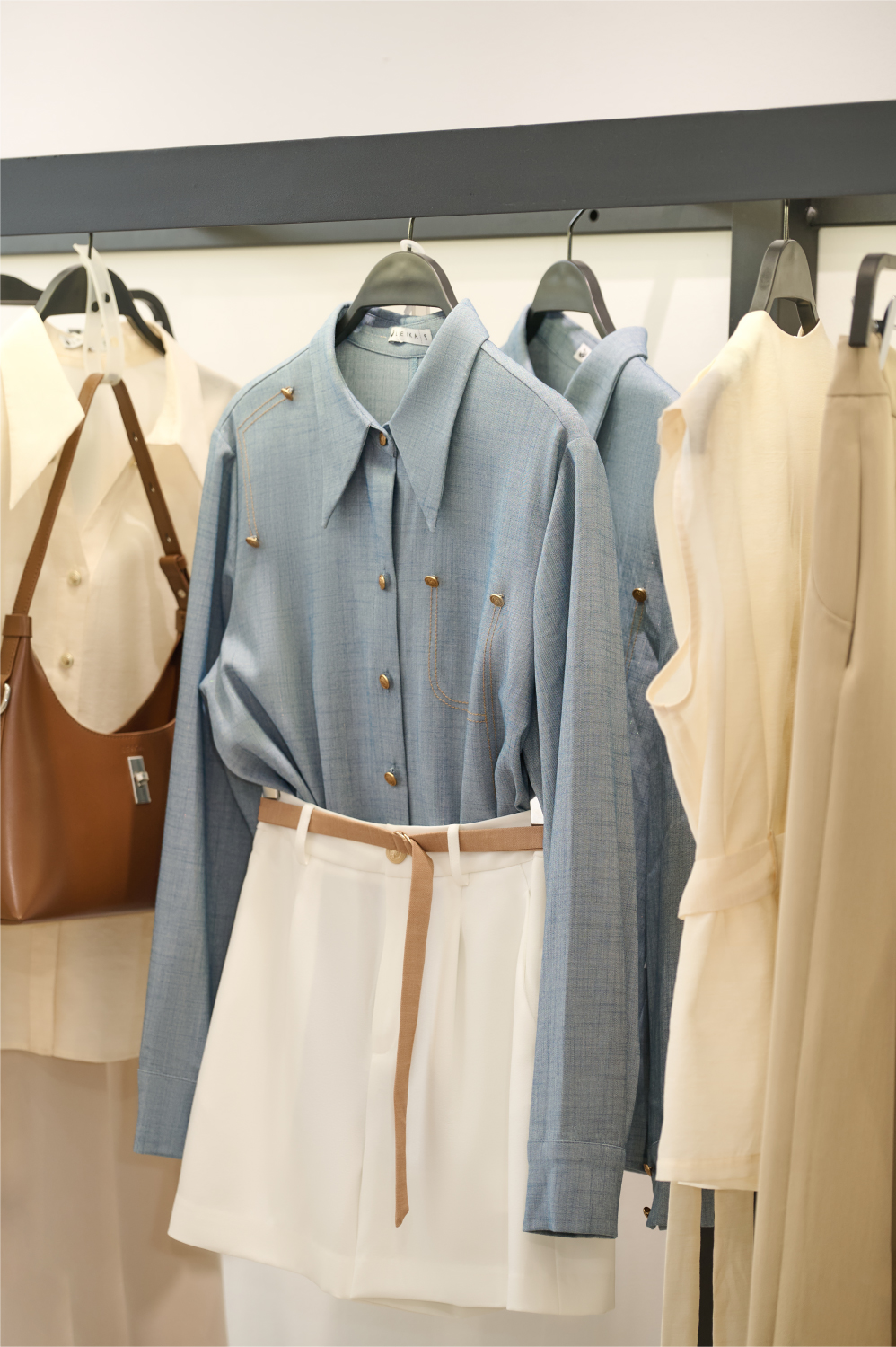 Chiếc áo sơ mi dài tay diễu chỉ giả túi ngực trong BST “French Elegance” là khúc hát mùa hè dành cho người phụ nữ hiện đại – tự tin, tinh tế nhưng không kém phần phóng khoáng. Sự thoải mái và thanh lịch giao thoa trong từng đường nét, như lời thì thầm nhẹ nhàng của sự nữ tính đầy tự chủ. Giữa cái nắng hanh hao của ngày hè, nàng vẫn hiện lên thanh thoát như ánh bình minh dịu dàng nơi biển sớm.