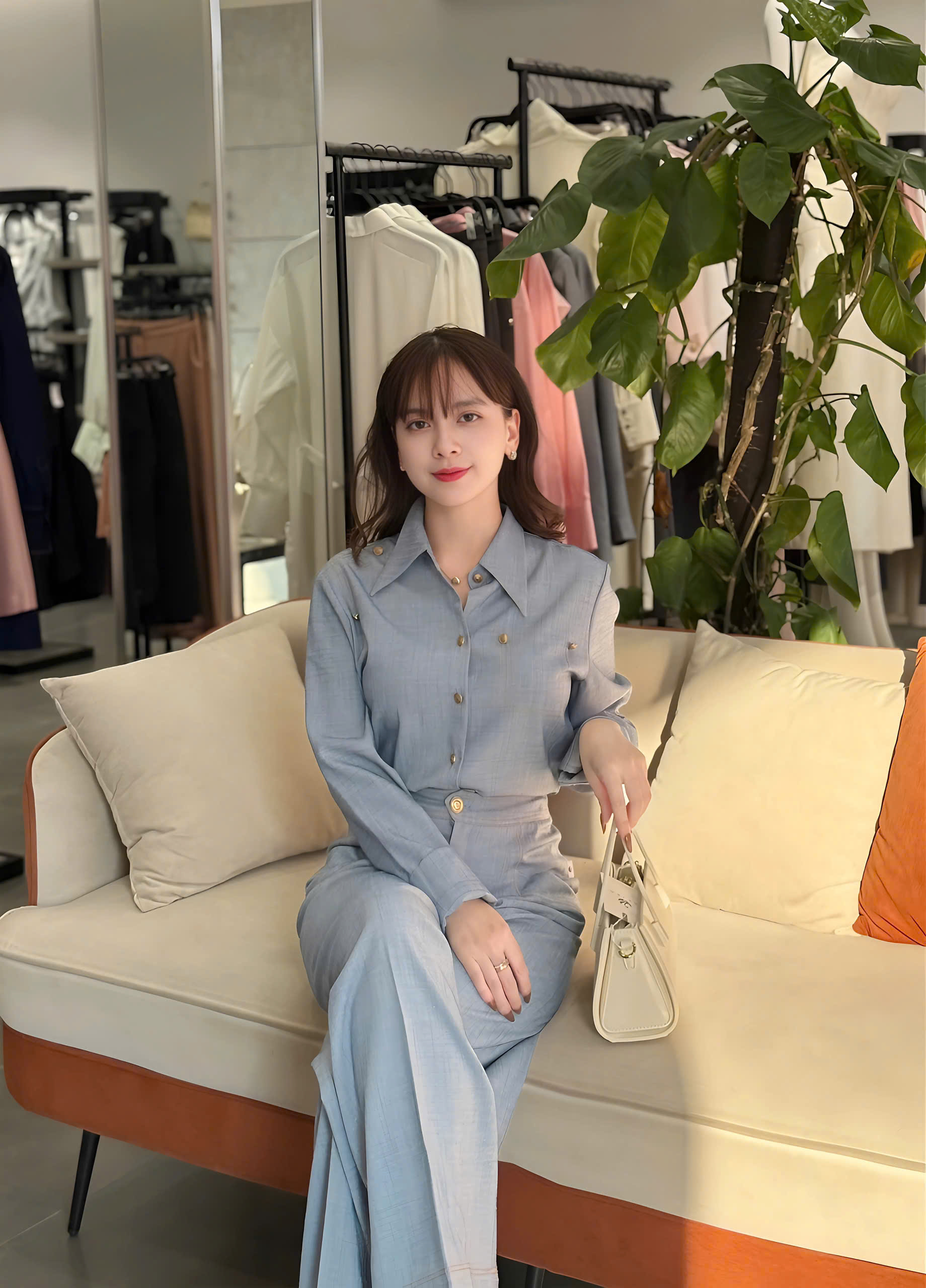 - Điểm nhấn: Đường diễu chỉ chạy đều từ cổ áo xuống ngực áo là điểm nhấn tinh tế, tạo chiều sâu cho thiết kế. Chiếc áo trở dài tay đa dụng – đủ lịch sự cho môi trường công sở, đủ thoải mái cho những buổi dạo chơi. Cúc áo màu vàng đồng mang lại nét cổ điển đan xen hiện đại, hài hòa với tinh thần “Elegant, not overdone”.