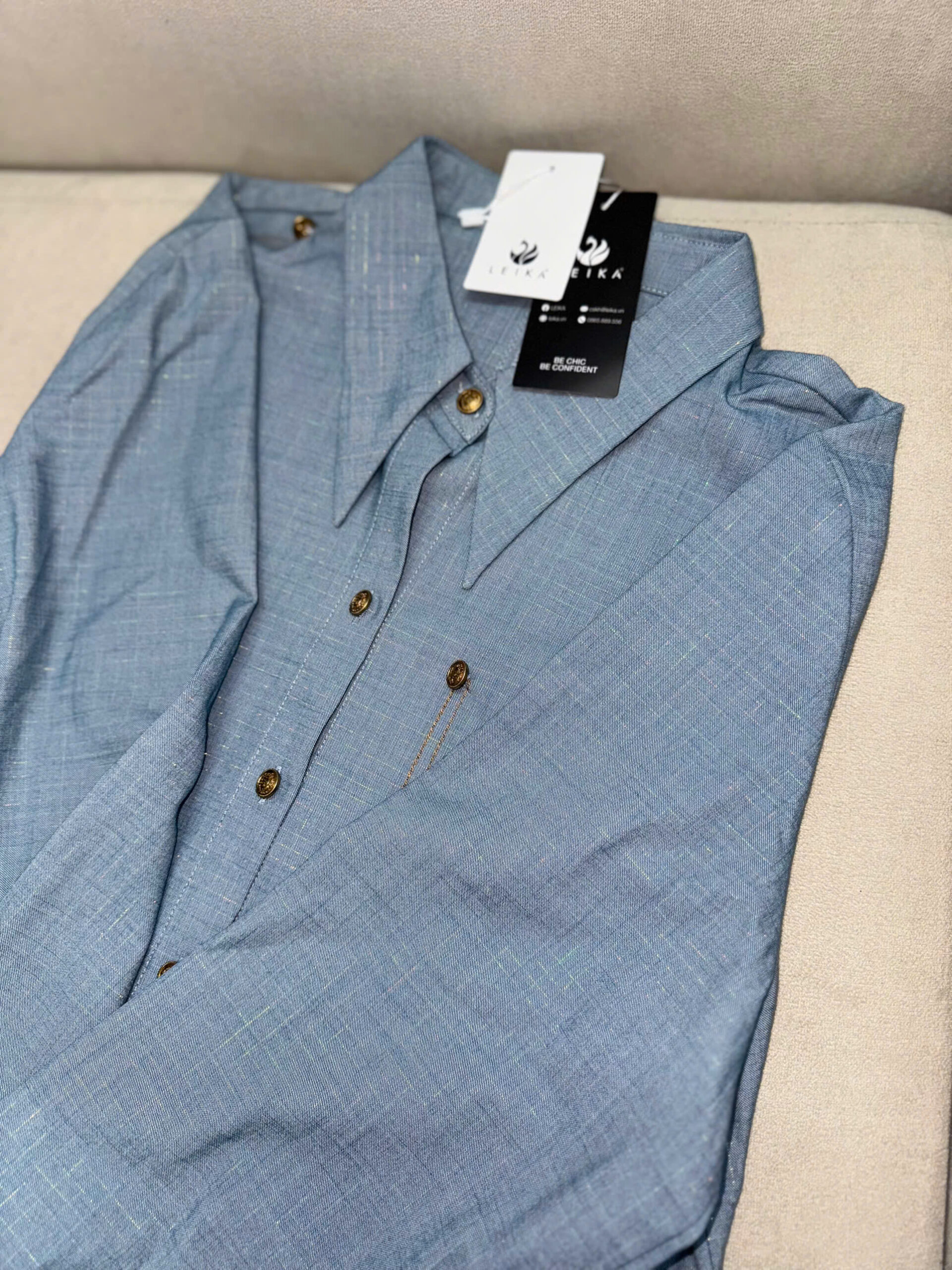 Chiếc sơ mi dài tay diễu chỉ với form cổ điển nhưng đầy sáng tạo qua đường diễu chỉ tinh xảo. Cổ áo sắc nét cùng hàng cúc màu vàng nổi bật tạo nên nét đẹp vừa truyền thống vừa hiện đại, phóng khoáng. Màu xanh dịu nhẹ như một làn gió, vừa thanh lịch, vừa mát mắt, khiến chiếc áo trở thành lựa chọn hoàn hảo cho những ngày hè nhuộm đầy sắc lửa.