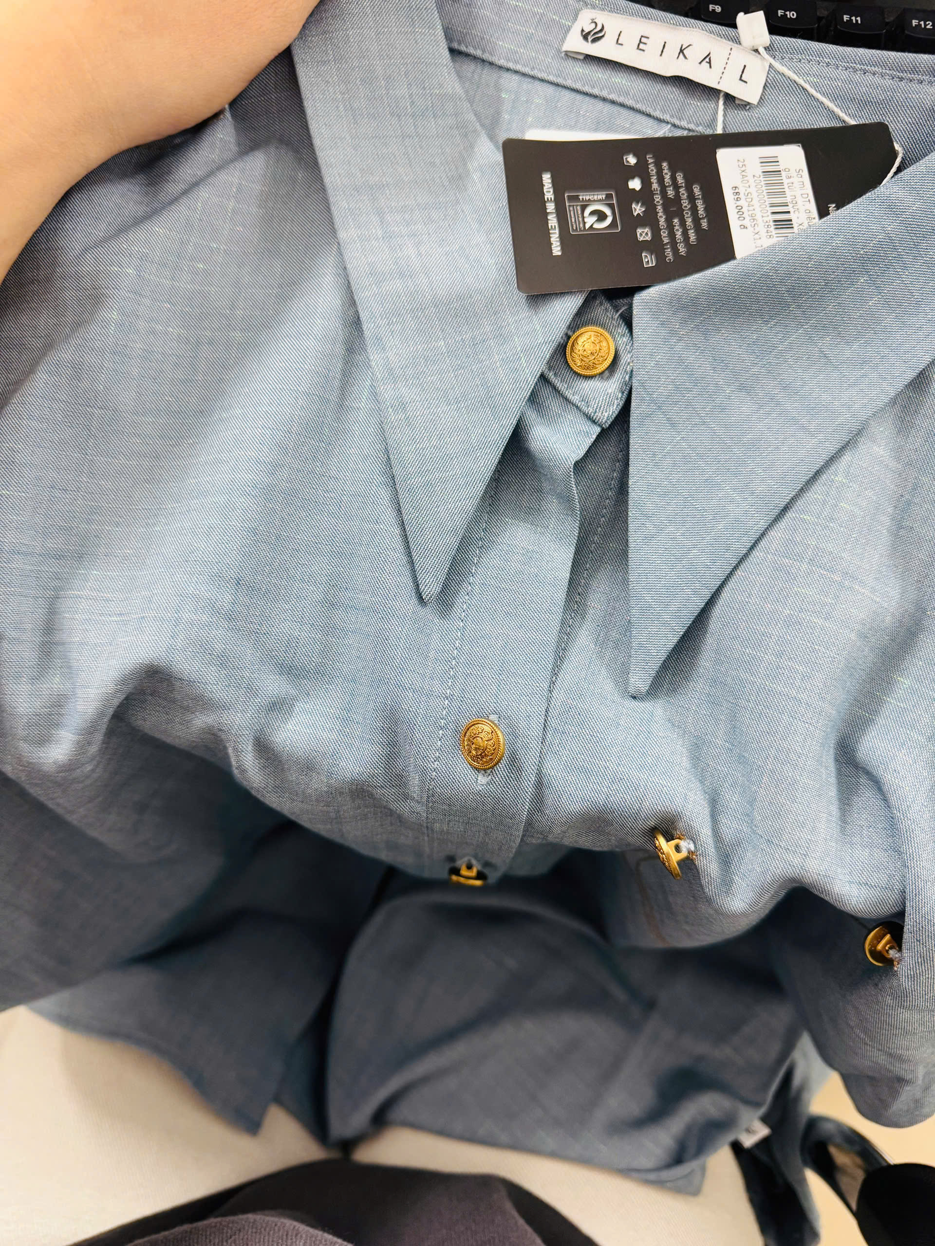 - Đặc điểm: Áo sơ mi dài tay diễu chỉ cổ bẻ, khuy vàng đồng.